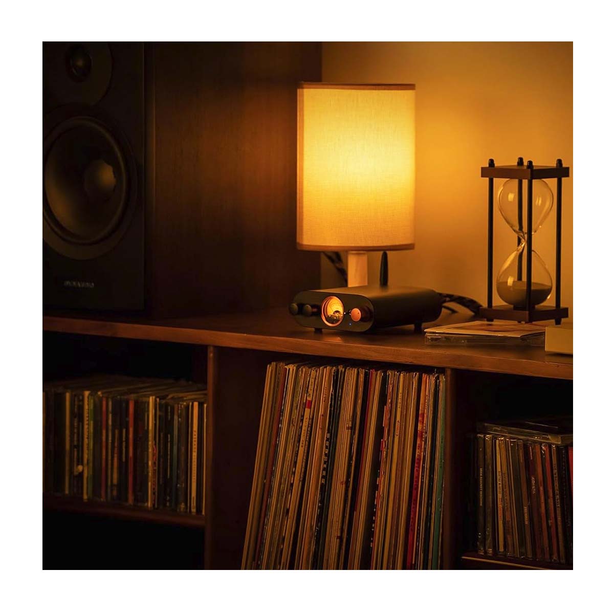 Designed for desktop, bookshelf, or compact living-room setups