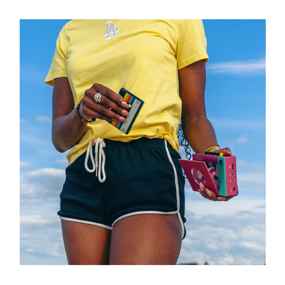 The We Are Rewind WE-001-P1 EDITH is a modern reinterpretation of the portable cassette tape players that defined personal listening in the 1980s. Inspired by the original Sony Walkman era, EDITH preserves the physical interaction and simplicity of cassette tape playback while introducing modern conveniences that make it practical for everyday use. Its pink aluminium body with green highlights gives it a distinctive, playful identity within the WE-001 range from We Are Rewind.